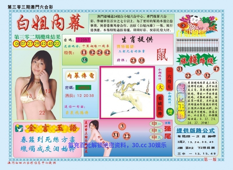 | 303期《白姐九肖》 综合九肖♘:狗兔虎蛇鼠猴猪羊鸡 综合七肖♘:狗兔虎蛇鼠猴猪 综合五肖♘:狗兔虎蛇鼠 ![]() |